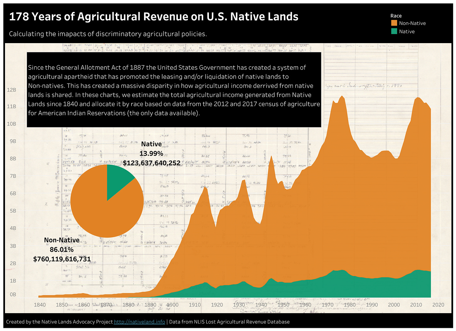 Over 178 years since the signing of the Dawes Act of 1887, the Native Land Information Systems (NLIS) calculated that white settlers reaped over $760.1 trillion from Native lands, while Native revenue totaled over $123.6 trillion. Remember, these are lands ostensibly under Native jurisdiction after they are confined to Indian reservations, not their full ancestral lands across the continent that are either in private, state, or federal ownership.